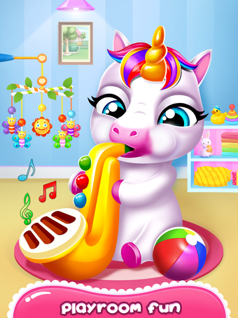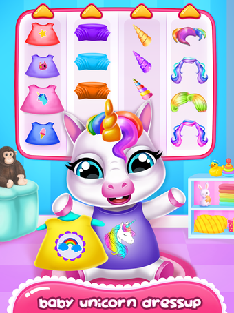 このゲームでは、ペットにおいしい食べ物を与えたり、お風呂に入れたり、さまざまなスタイルで着せ替えたり、曲を演奏したりするなど、さまざまなアクティビティが用意されています。また、自分の選んだ虹色でユニコーンの部屋を飾ったり、ベビーペットのおもちゃで遊んだりすることもできます。